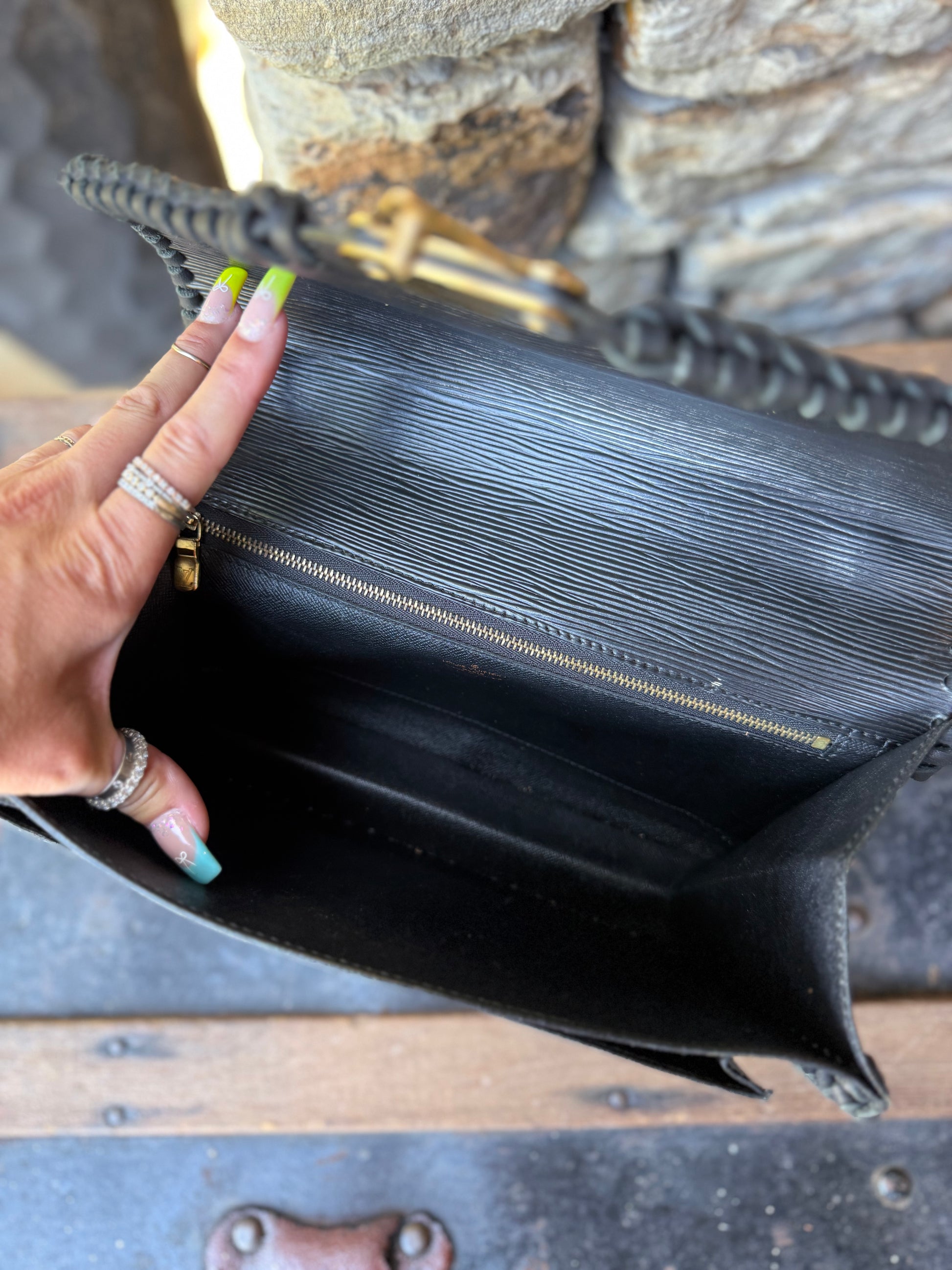Bold. Braided. One of a kind. This custom Louis Vuitton stuns with handwoven black leather edges, a statement graffiti-style strap bursting with lightning bolts, roses, and retro vibes — plus a touch of turquoise and howlite beadwork that adds a Western glam twist.